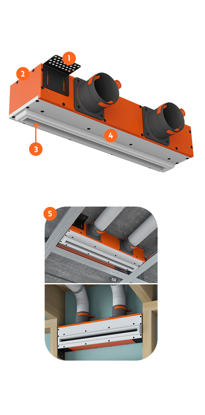 Anemostaty LINEO zapewniają efektywne zrównoważenie przepływu powietrza, szybkie i szczelne podłączenie do kanałów oraz oszczędność miejsca. Widoczna pozostaje jedynie minimalistyczna linia, stanowiąca stylowy element wnętrza.